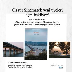 ÖZGÜR SİNEMATEK DESTEKLENEN FİLMLER Ahraz (Ahmet Keçili, Yapım Aşamasında) Nisan 4, 2026 Daha Fazlası » Toprağın Ayak İzi (Mert Eşberk, Yapım Aşamasında) Nisan 4, 2026 Daha Fazlası » A Basket of Ribbons (Sally Haloubı, Yapım Aşamasında) Nisan 4, 2026 Daha Fazlası » « Önceki Sayfa1 Sayfa2 Sayfa3 … Sayfa5 Sonraki » HABERLER Özgür Sinematek yeni üyeleri için bekliyor! Mart 4, 2026 Geç ve güç oldu ama sonunda binamızdaki tadilat süreci bitti. Asıl mekanımıza yerleştik. Özgür Sinematek artık hazır. Açılışı, Özgür Sinematek Devamını Oku » Jump MonthsCurrent Month JanuaryFebruaryMarchAprilMayJuneJulyAugustSeptemberOctoberNovemberDecember 20242025202620272028