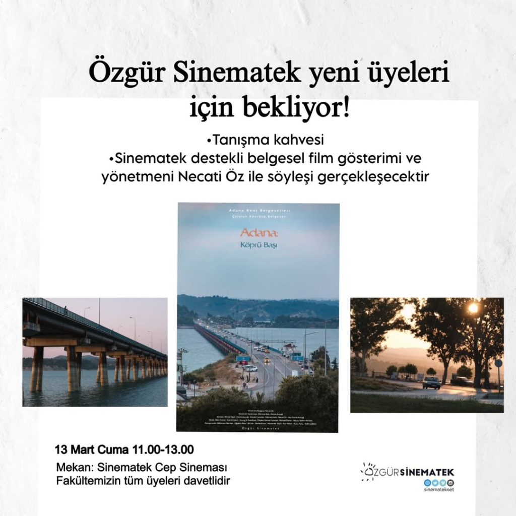 Açılışı, Özgür Sinematek destekli ilk filmlerinden “Adana: Köprü Başı” belgeseliyle yapıyoruz. Ardından filmin yönetmeni Necati Öz ile söyleşimiz olacaktır.